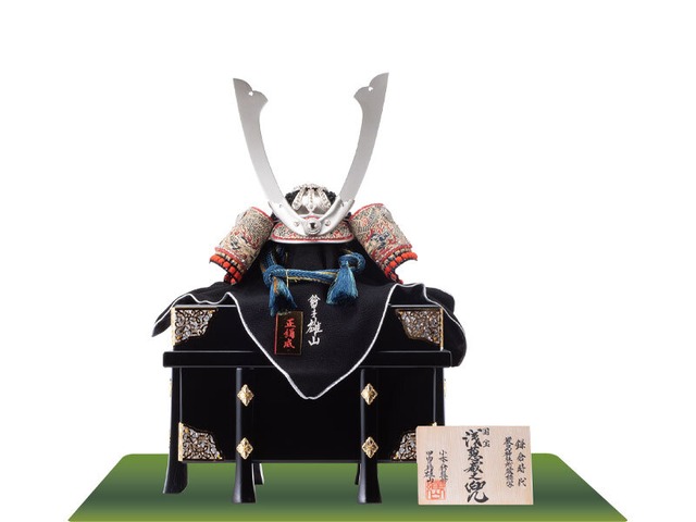 【商品概要】 間口35cm×奥行29cm ※お櫃のサイズです。毛氈は含みません。 ※こちらの商品には屏風・弓太刀は付きません。 ・源氏八領の一つ「盾無しの大鎧」と呼ばれている鎧の兜で、鍬形台・吹き返しに花菱形の飾り金物を、韋所には襷に丸獅子文様を用いています。 ・全体は小桜紋様の韋で威してあり、鉢は合わせ鉢を使用しています。 ・お櫃は総金具付きで、紗張りを施してあります。 ・落ち着いた兜飾りです。 ・・─・・─・・─・・─・・─・・─・・─・・─・・─・・─・・─・・・・─・・─・・─・・─・・─・・─・・─・・─・・─・・─・・─・・ 【ご購入特典】 陣羽織、オルゴール付きお名前木札、お手入れセット、グリーンの毛氈 ※オルゴール付きお名前木札について※ ご購入の際に「お子様のお名前」「お子様の生年月日(和暦)」をのご入力をお願いいたします。 入力内容にお間違えが無いか、カートへ入れる前に、再度ご確認をお願いいたします。 【商品のお届けについて】 商品は、お日柄の良い大安や友引の日にお届けいたします。 当店から送付するご注文承諾メールに、最短の配達日を記載いたしますので、 メール内容を必ずご確認頂きますようお願いいたします。 配達日時を変更したい場合は、当店からのメールに返信いただければ配達日時の変更が可能です。