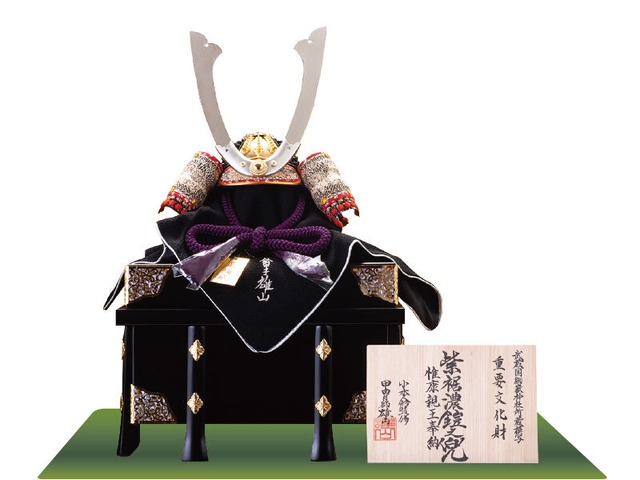 【商品概要】 間口84cm×奥行45cm ・鎧兜の上部より白・黄・薄紫・紫と威してある美観に優れた大鎧。この大鎧は鎌倉幕府の七代将軍惟康親王が元寇の際に蒙古軍の撃退を祈願して奉納したと伝えられています。 ・鎧兜の上部より白・黄・薄紫・紫と威してある美観に優れた大鎧。 ・この大鎧は鎌倉幕府の七代将軍惟康親王が元寇の際に蒙古軍の撃退を祈願して奉納したと伝えられています。 ・胴体の韋所には藻獅子文様が施されています。兜鍬形台には菊丸の金具がついています。袖の飾り金具には菊丸の金具がついています。 背面の胴には動作がしやすいように逆板がついています。 ・台と屏風枠には伊保田蝋仕上げの焼桐を使用。 屏風は金沢箔を使用。二折屏風でコンパクトに。 ・取り扱いのとても楽な焼桐の台・屏風に木製品の高級弓太刀 を付けた、すっきりと鎧の映えるお飾りセットです。 ・・─・・─・・─・・─・・─・・─・・─・・─・・─・・─・・─・・・・─・・─・・─・・─・・─・・─・・─・・─・・─・・─・・─・・ 【ご購入特典】 陣羽織、オルゴール付きお名前木札、お手入れセット、グリーンの毛氈 ※オルゴール付きお名前木札について※ ご購入の際に「お子様のお名前」「お子様の生年月日(和暦)」をのご入力をお願いいたします。 入力内容にお間違えが無いか、カートへ入れる前に、再度ご確認をお願いいたします。 【商品のお届けについて】 商品は、お日柄の良い大安や友引の日にお届けいたします。 当店から送付するご注文承諾メールに、最短の配達日を記載いたしますので、 メール内容を必ずご確認頂きますようお願いいたします。 配達日時を変更したい場合は、当店からのメールに返信いただければ配達日時の変更が可能です。