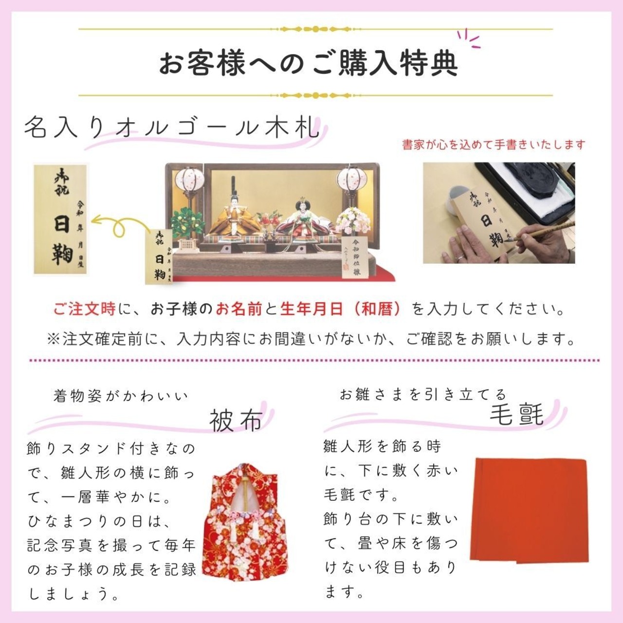 ・赤い被布、オルゴール付きお名前木札、お手入れセット、赤い毛氈がつきます。