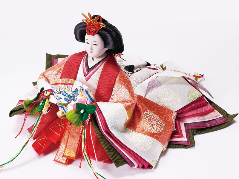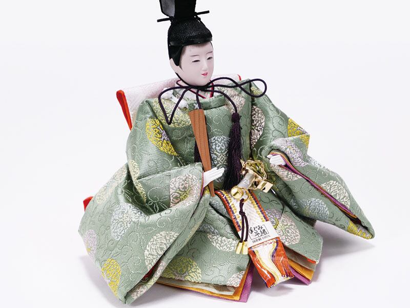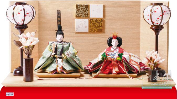 ○有職文様の衣裳が清楚な印象のお雛様に、モダンな屏風を合わせ、上品にまとめた親王飾りです。