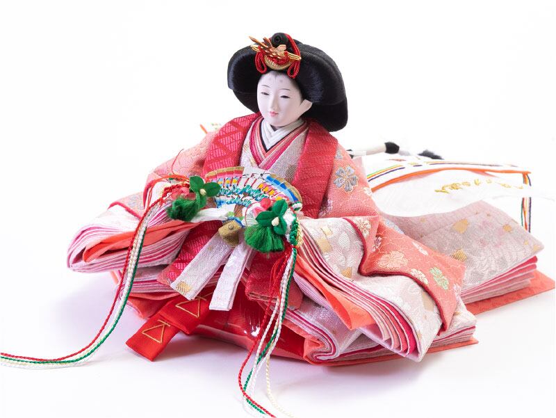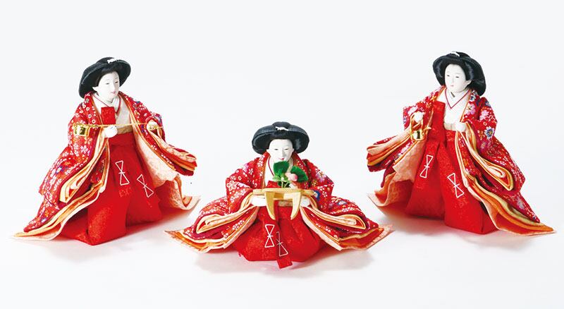 ○三人官女は七宝文様のサーモンピンクの衣裳で可愛らしく合わせました。