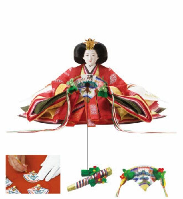 ○飾り台・屏風枠・親王台には焼桐をあしらい、雪洞やお道具には木製品を使用した、温かみのあるお飾りです。