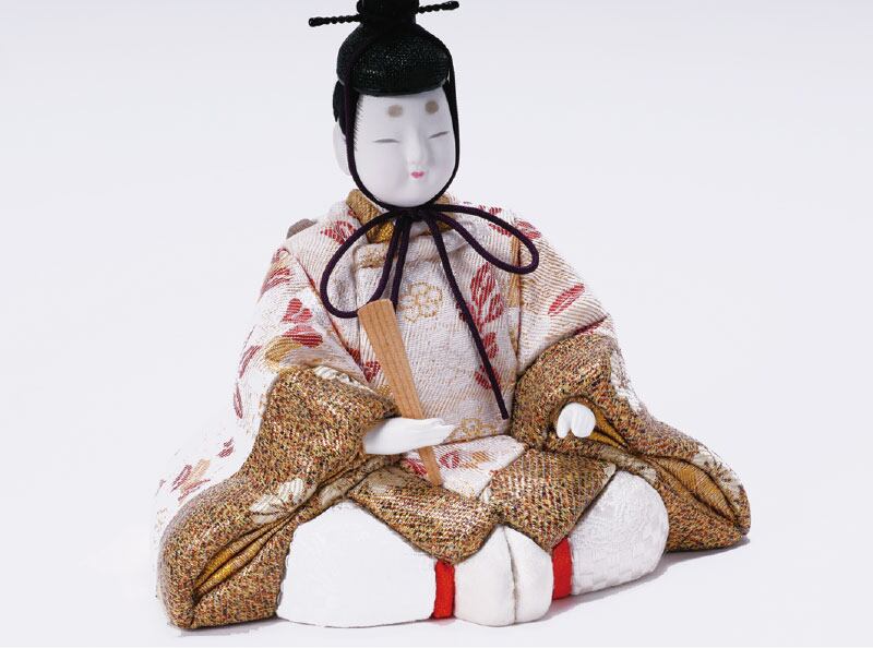○男雛は牡丹、女雛は梅・楓・藤・菊・牡丹を織り込んだ、さんご色がやさしい四季花の衣裳です。
