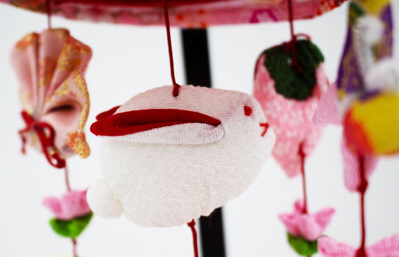 ○ちりめん素材で、ピンク色のうさぎと鞠が付いています。