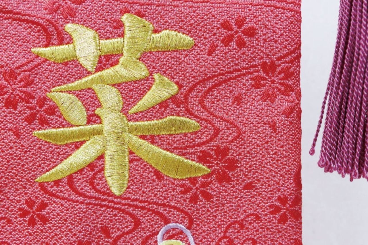 ○お子様のお名前と生年月日は、ピンク地に映える金色の刺繍で入ります。