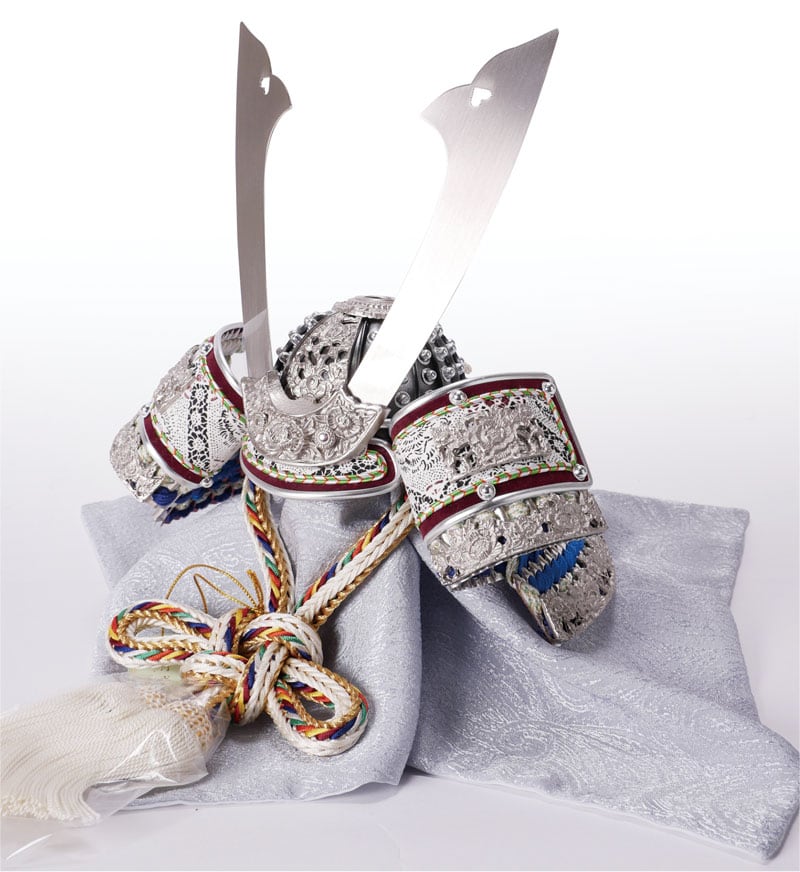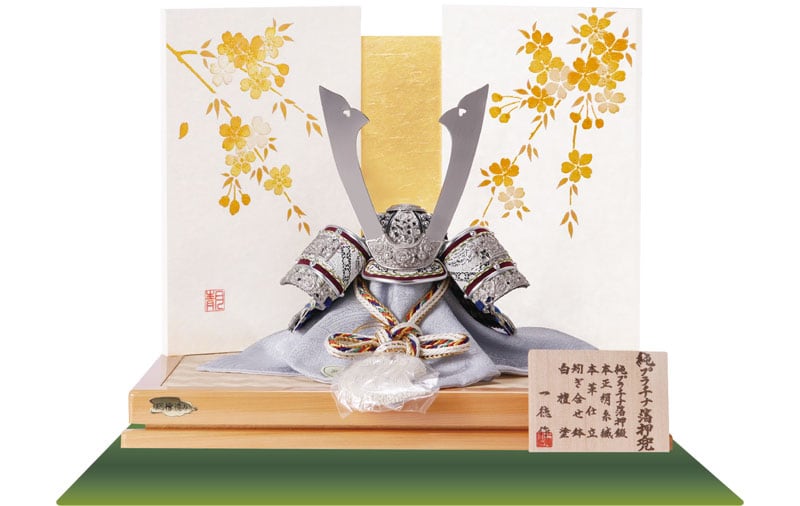 ○七色の忍び緒と淡い水色の袱紗、プラチナ箔の兜が織りなす上質な風合いが、桜と金の屏風、そして檜の飾り台によく映える兜飾りです。