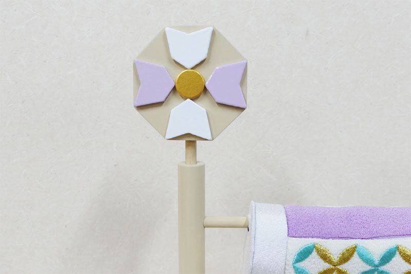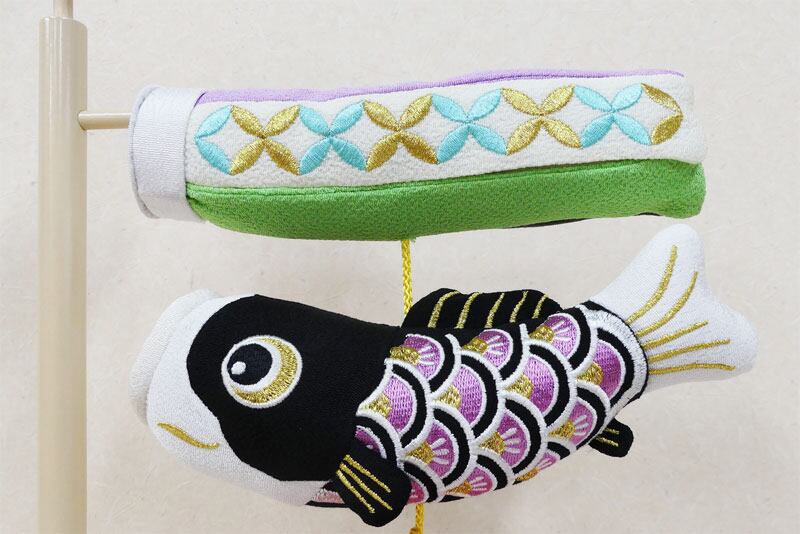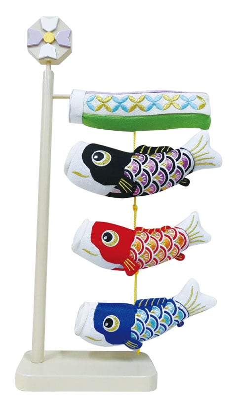 ○鯉のぼりを連想させる飾り台に、七宝柄の吹き流しと黒・赤・青の3匹の明るいカラーの鯉飾りをあしらいました。