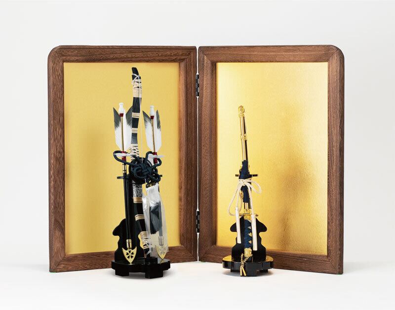 ・お櫃は総金具付きで、紗張りを施してあります。屏風枠と台には焼桐を使用。 屏風は金沢箔を、弓太刀は木製極上品を使用しています。