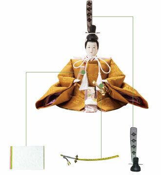 ・焼き桐台に伝統的な金屏風を使用し、お人形は明 い有職文様。