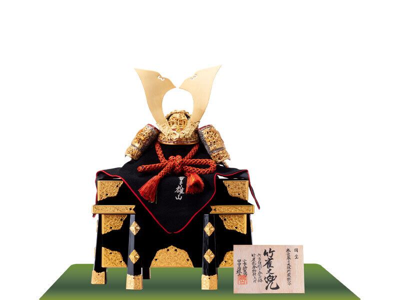 ・豪華な装飾兜が黒い袱紗とお櫃に映え、品のある兜です。