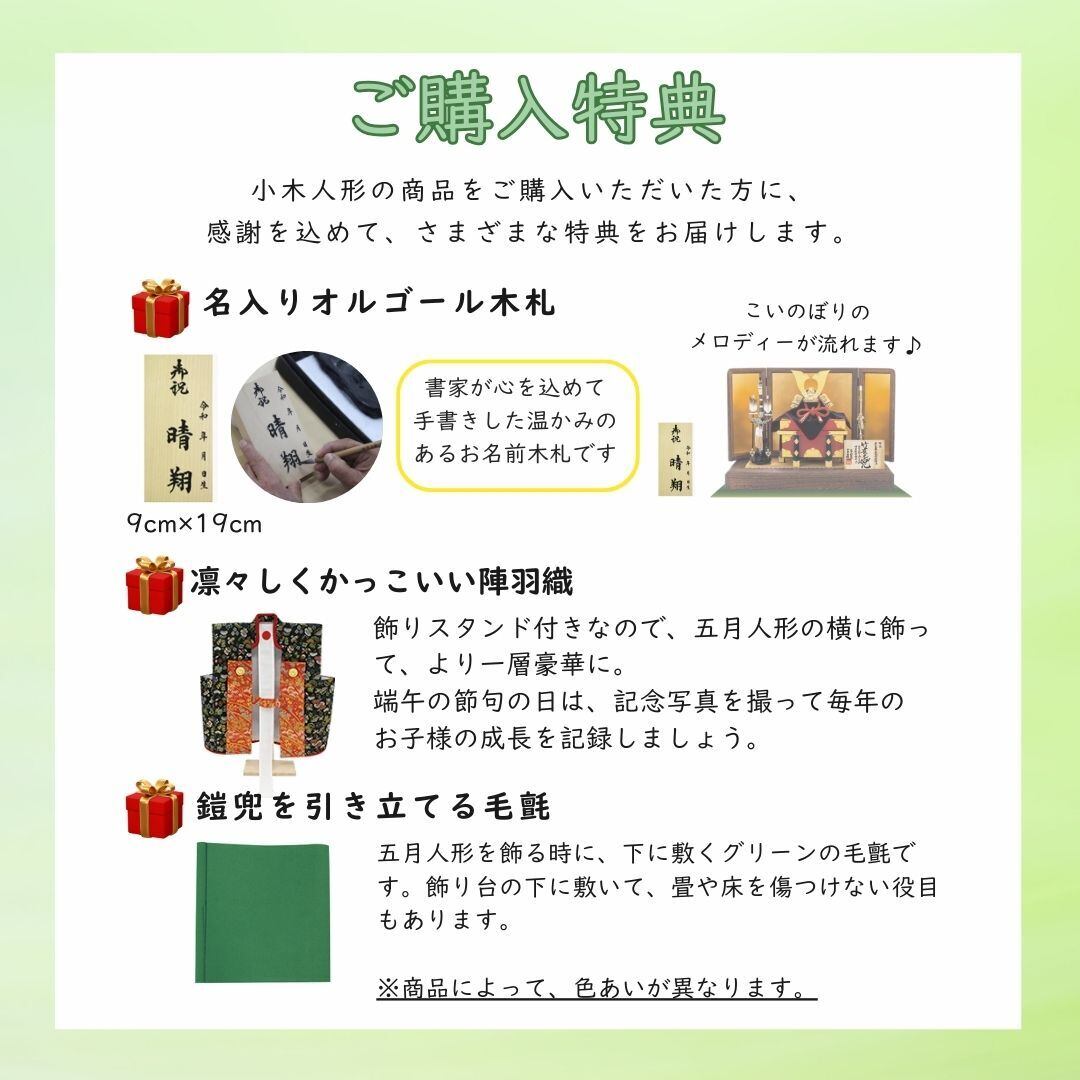陣羽織、オルゴール付きお名前木札、お手入れセット、グリーンの毛氈